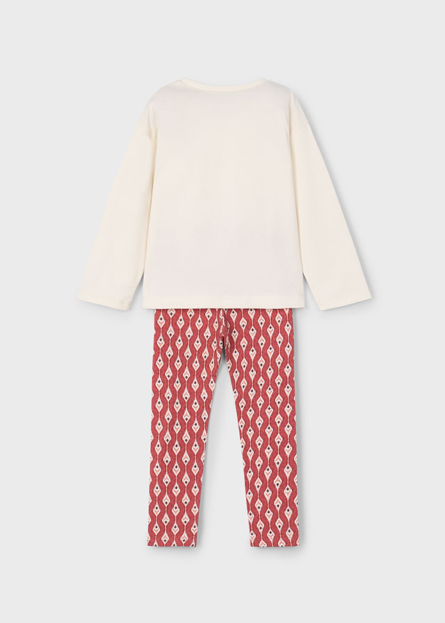 Komplet z legginsami ze wzorem i koszulką dla dziewczynki w kolorze czerwono-pomarańczowym to idealna propozycja dla małych miłośniczek mody które cenią sobie wygodę i styl koszulka o klasycznym kroju została ozdobiona modnym nadrukiem który dodaje dziewczęcego uroku natomiast elastyczne legginsy z ciekawym wzorem idealnie dopasowują się do sylwetki zapewniając swobodę ruchów podczas zabawy spacerów czy codziennych aktywności